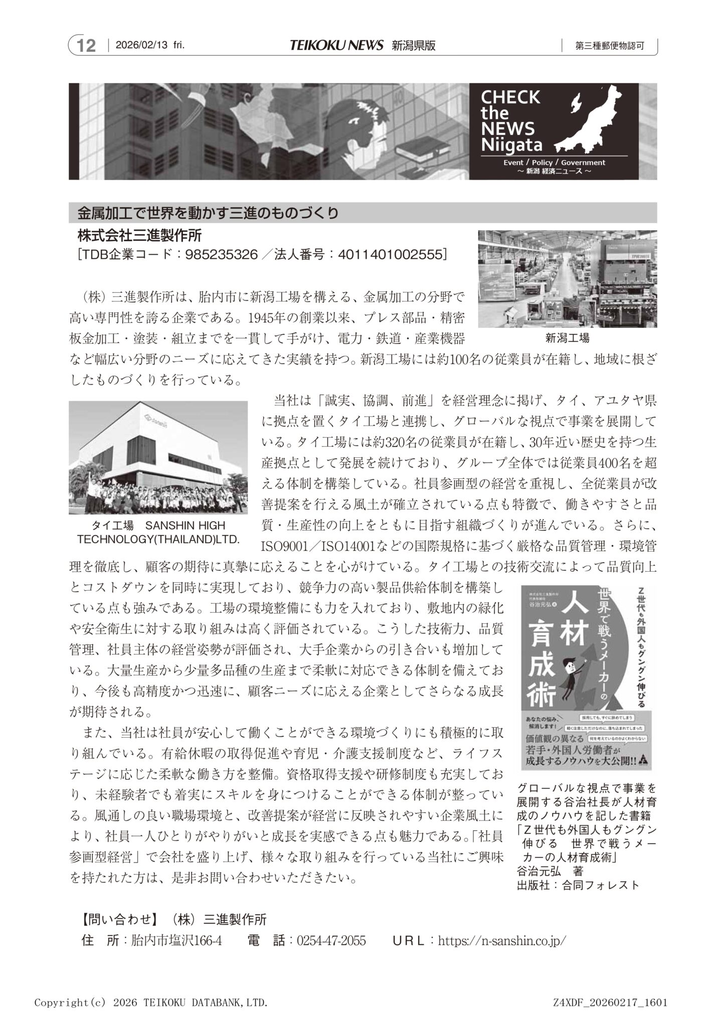 「週刊 帝国ニュース 新潟県版」(2026年2月13日号)にて当社が紹介されました。 投稿者: sanshin_adm1n_012月 25, 2026News 「週刊 帝国ニュース 新潟県版」(2026年2月13日号)にて 当社が紹介されました。 この度、帝国データバンク発行の週刊誌『週刊 帝国ニュース 新潟県版』(2026年2月13日号)特集「CHECK the NEWS Niigata」にて、当社をご紹介いただきました。 記事では、当社の特徴や強みをはじめ、社員育成への取り組みやものづくりへの姿勢など、“社員が主役”という企業文化が伝わる内容となっております。 ぜひご一読ください。